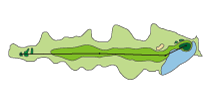 コース右側にはウォーターハザードもあり、第2打はグリーン面が見えず、グリーンも縦長で奥へ向って下っていてクラブ選択が難しい。
